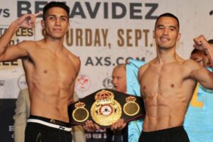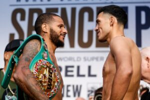 Dirrell, meanwhile, was content to backpedal and look for openings, and although he enjoyed a certain degree of success with jabs to the body coupled with counter right hands, he was unable to seriously deter Benavidez’s relentless forward march.